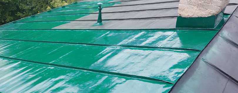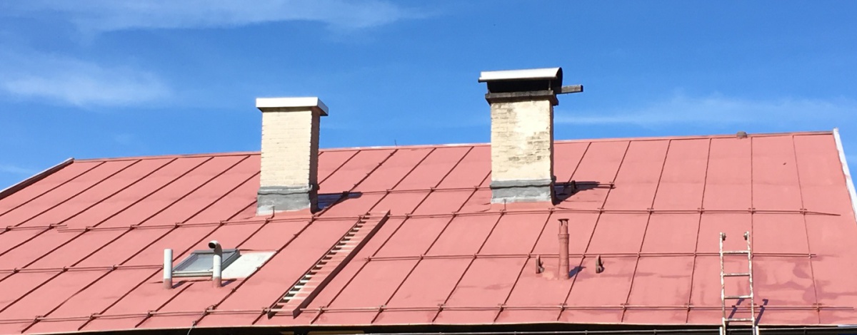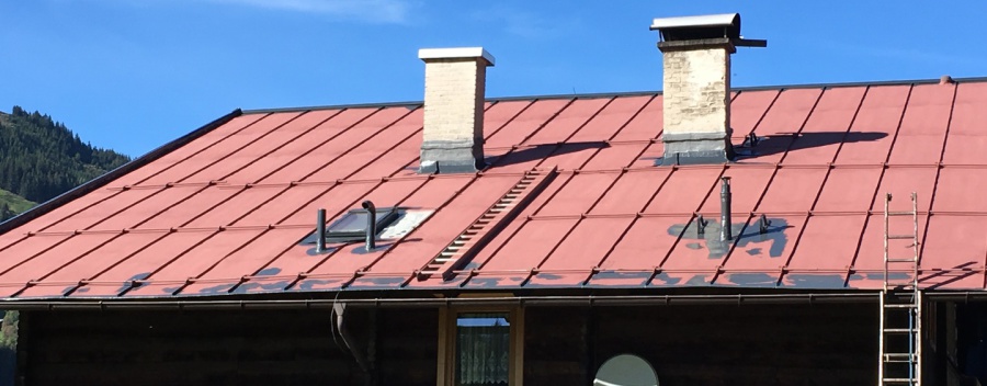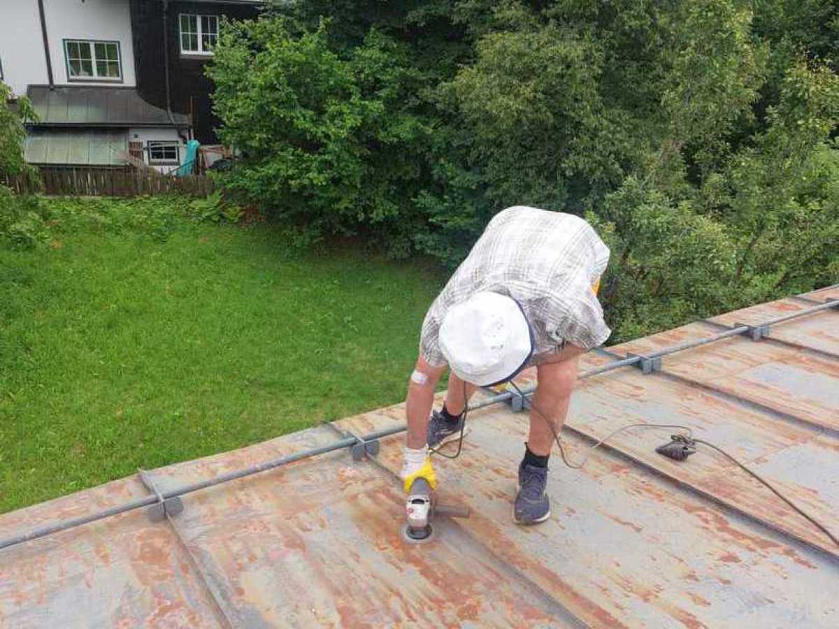 Je nach Beschaffenheit des Blechdaches wird die Rostschutz Grundfarbe aufgetragen.