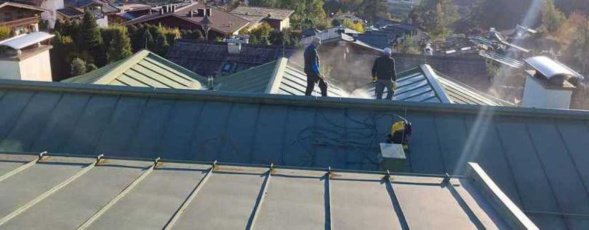 Das Dach wird mit einem Hochdruckreiniger staubfrei gereinigt. Dachrinnen und Einfassungen sowie Pfälze müssen ebenfalls staubfrei vor dem Rost- Grundanstrich gereinigt werden.